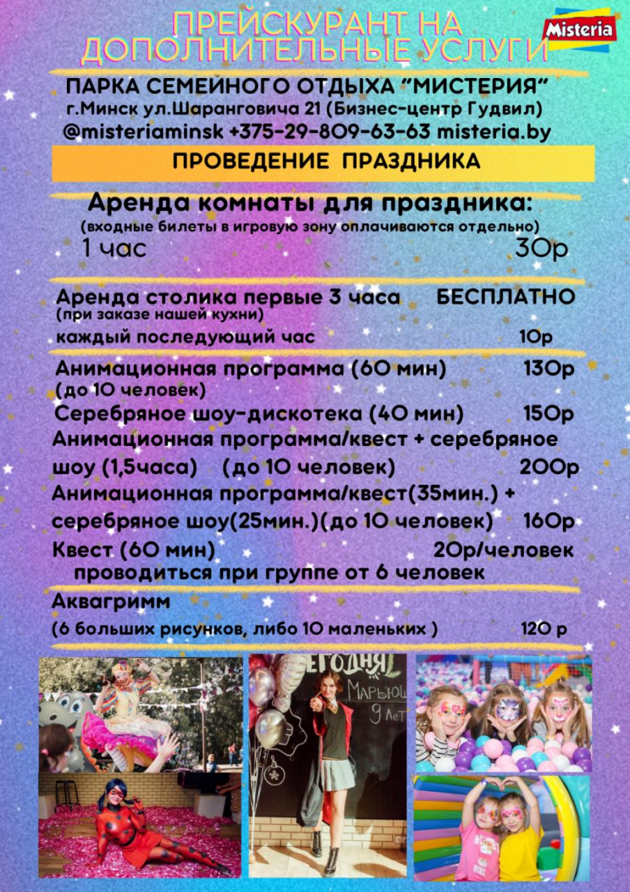Все посетители обязаны ДО начала подтвердить, что не имеют никаких противопоказаний к посещению парка и другим видам физической нагрузки. Факт приобретения услуг по пребыванию на территории парка семейного отдыха «Мистерия» является подтверждением отсутствия каких-либо противопоказаний к посещению парка.